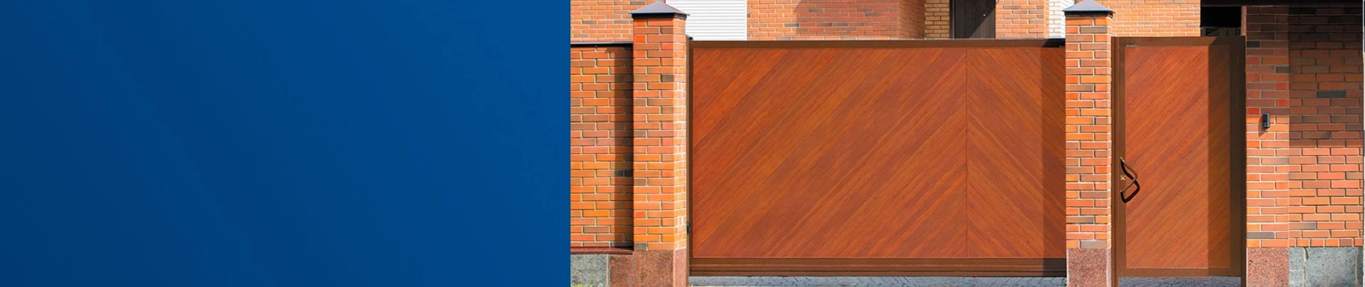Откатные ворота – удобный вариант для небольших участков. Простое и легкое открытие, экономия места, отличная устойчивость к порывам ветра и попыткам взлома удачно дополняются привлекательным внешним видом изделий. Наполнение полотна – вертикально расположенные сэндвич-панели с имитацией фактуры древесины. По верху щита проходит украшение в виде кованых пик. Это и красиво, и практично, так как уменьшает риск проникновения злоумышленников.
