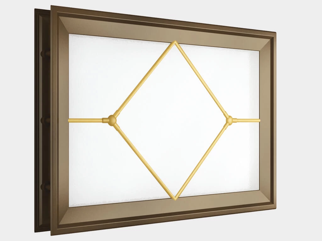 Окно акриловое 452 × 302, коричневое с раскладкой «ромб» (арт. DH85629). Специальная конструкция обеспечивает плотное прилегание к полотну ворот, что защищает его от промерзания и теплопотери. Стилистическая вставка в форме ромба. Окантовка коричневого цвета.